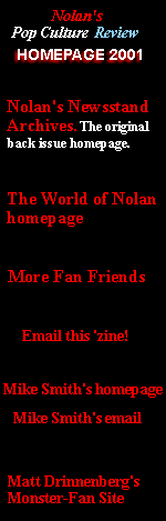 say, a property tax break or anything) and Tampa, Florida will be exposed to the world in the greatest possible light. I like that part best. Thanks for requesting this information for your website. (My pleasure!---N) JUSTICE? GOOD RIDDANCE SPEAKING OF JESSE'S GIRL Nolan. How's it going? Long time no see. I like your site. The new look is especially good. (Thank you---N) I've had great fun reading my bro Matt's and Mike's stuff. (Me, too!---N) I was particularly intrigued by the top 10 guitarists discussion, so I thought I would send along a list of my own to see what you think? If I were to name the first guys that come to mind, I would certainly have some overlap with you guys. But what I decided to do was come up with a list that doesn't repeat any of the guitarists already mentioned. I've also divided them into categories. Here goes: CATEGORY 1: TECHNIQUE/SKILL CATEGORY 2: SOUND/STYLE CATEGORY 3: INFLUENCE CATEGORY 4: FOR HARDCORE GUITAR FANS: CATEGORY 5: WHAT WAS HIS NAME? Okay, so that's eleven. But it's a good eleven. And there could be others added. I could have put someone from Lynyrd Skynyrd in the sound category, but I'm not sure which guy is responsible for the great sound. Maybe they all belong there together. But I'll stop there. Let me know what you think. Mark, I think it's a terrific list with honest and insightful comments. You've inspired me to take this opportunity to correct one unbelievable oversight on my part regarding my original Top 10 guitarists list: "Mike's Rant" is © 2001 by Michael A. Smith. "Matt's Rail" is © 2001 by Matt Drinnenberg. I thank Mark Drinnenberg for going to the trouble of writing such a soul-searching list (original letter's copyright is implied on publication). Entire contents © 2001 by Nolan B. Canova