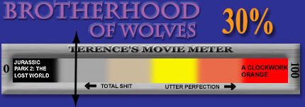 | The "Terence's Movie Meter" graphic was a pretty big hit when it debuted in PCR #91 after "The Lord of the Rings" came out (Terence gave that a 98% on the meter). The reaction surprised both of us. Basically, Terence loves rating movies, but hates writing reviews (even though I thought he did a superb job with Ghost World). I argued that the whole point of the PCR was commentary. So, as a compromise, the meter was born. Terence's Movie Meter returns with this potpourri issue of PCR Movie Review with his singular take on "The Brotherhood of Wolves". | ||||
