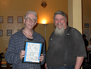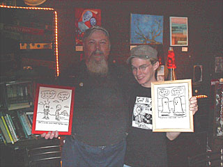 After hanging out a while, Will and I purchased some T-shirts from Josh and I bought some original art. The ones I got were among my favorite gags seen on his website's gallery, the mutually booing ghosts, and the alien ass-sex. (While these are not copies per se, Josh does re-draw particularly popular pieces from time to time, and these are always noted. The framed originals he sells are just that...hand-drawn originals.)