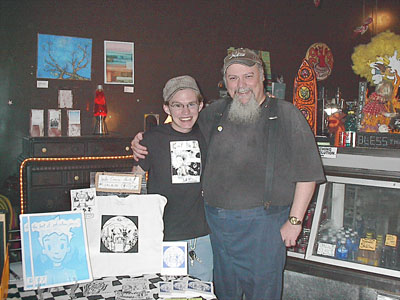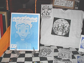 Josh's "booth" was a small table off to the left side just before you enter the main bar/counter area. It was covered with books, pamplets, buttons, comic collections and T-shirts, all Josh-centric. Pint-sized Josh himself beamed as we entered, we haven't seen each other in a while, I'm sure Will and I were beaming, too.