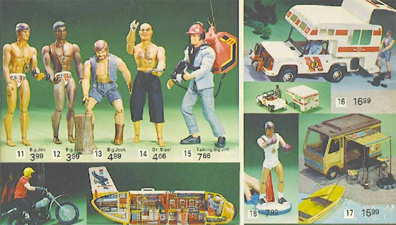 In the early 1970’s, G.I. Joes toys were beginning to fall out of favor due to his close ties to the United States military. Mattel was only too ready to offer a competing action figure line that was a little smaller, a little cheaper, and a whole lot gayer than G.I. Joe – Big Jim! The biggest feature Jim had was a karate chop action arm that he flailed wildly whenever the button on his back was pressed. Unfortunately, karate chops were just about the only thing his unarticulated hands were good for! Mattel also wasted little time in retooling many of Barbie’s accessories for Jim even though she was a larger scale doll! The photos shown here were from around the middle of the Big Jim run when Mattel was trying to phase out the less than spectacular sports sets and infuse some much needed adventure themes. They even added a villain for Big Jim to fight but the chrome fisted Dr. Steel quickly switched sides when the P.A.C.K. series came out a short time later. Did Mattel ever seriously think that G.I. Joe would feel threatened by a guy in bicentennial underwear?
