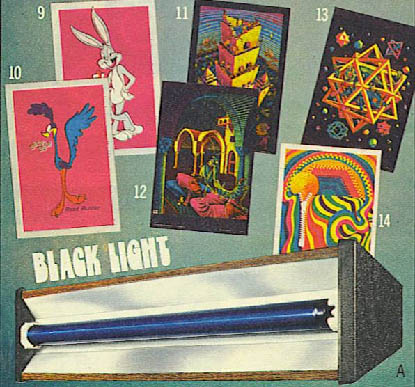 Here’s a real blast from the past for those both old enough to have lived through the 70’s and sober enough to have survived! For those who don’t remember, these were wall posters in groovy florescent colors that appeared to glow when a special light was shined on them. This was probably a phenomenon best appreciated stoned but even without the accompanying black light effect these were still some cool posters. I found this advertisement to be particularly interesting because I would have never thought of Bugs Bunny or the Road Runner as trippy and poster 14 has a Rorschach like effect that looks like a constipated tiki to me!