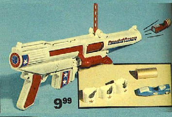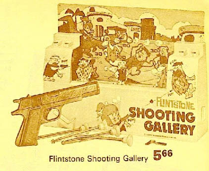 The first time I saw this ad I nearly broke down laughing. I don’t know if it was the violence or the incongruity that got me, maybe it was a combination of both. First off, I have no idea how the concept of the Flintstones lends itself to a shooting gallery. Sure, they had guns on the Flintstones but they were always some type of sling shot contraption, not a model 1911 .45 caliber automatic! When you combine this with the fact that the artwork shows both Barney and Pebbles gunning for Fred and Pebbles is busting a literal cap in her father’s ass, I’m already laughing again! What’s next, the Flintstone’s Drive-By Playset? The gallery looks like one of those wind up tin litho toys from Japan and the gun is a tried and true rubber dart launcher. I actually found this ad in a 1970’s catalog which must have been when the 1960’s prime time show was at its peak in week day syndication. They just don’t make kids toys like this any more and probably for good reason!