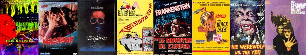 Some more titles. From left; The Beyond, Macabre, Inferno, This Stuff'll Kill You, Frankenstein and the Monster fro Hell, Blood and Black Lace, Werewolf vs. The Yeti, Let Sleeping Corpses Lie.